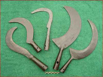RépondreSupprimerSerpe à débroussailler, image à gauche: Les deux serpes longues, avec manche en corne, s'appellent 'coutelle' - serpe du région Pyrénées occidentales (vers la ville d'Abitaine) - image à droit, en bas: la serpe avec deux viroles sur le manche est un Dah, de Birmanie (probablement un outil d'exportation).